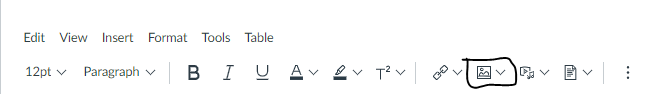 - If you wanted to use an image from your Canvas account files click on the arrow next to the image icon to display the following menu. A window will open. In that window browse to and select the picture file.
